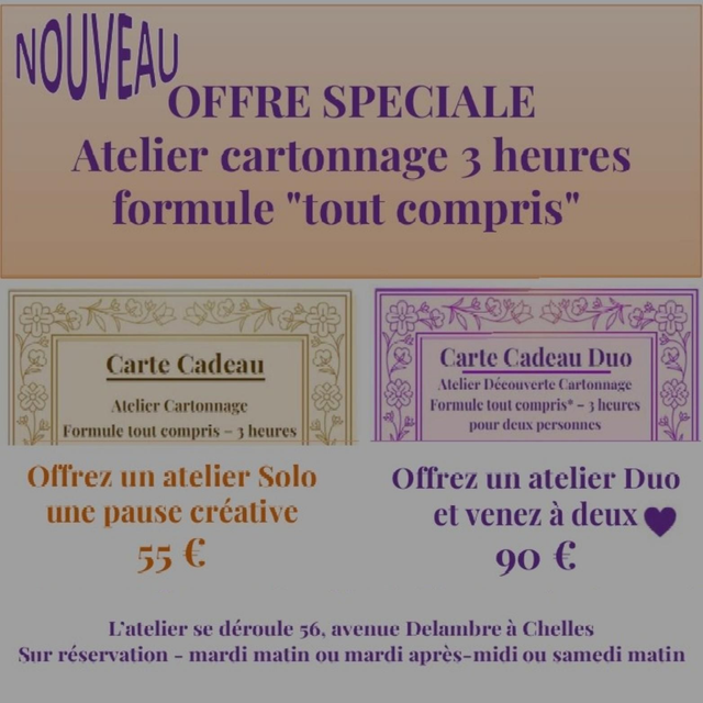 A partir du semi-kit de votre choix* vous apprendrez à monter un volume et/ou faire une charnière plate à partir de carton. Tous l'outillage et les consommables sont à disposition. Vous choisirez vos finitions en piochant dans la sélection de papiers et d'accessoires disponibles à l'atelier.