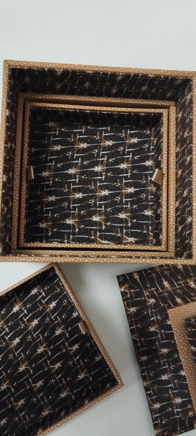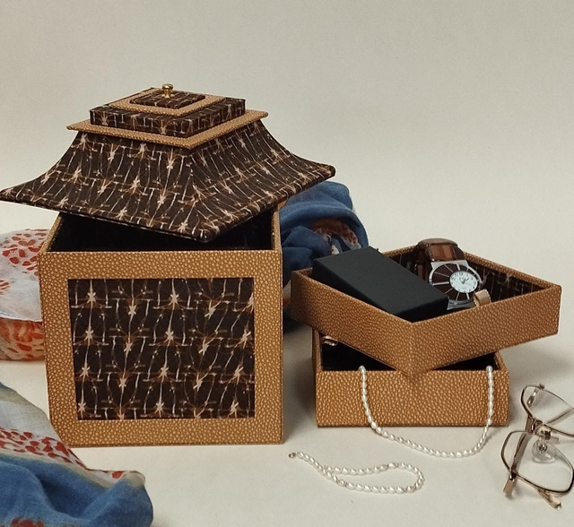 Boîte à bijoux style pagode. Nombreux rangements pour y déposer vos bijoux et autres petits trésors : 2 paniers amovibles, une cache dans le couvercle et un espace en fond de boite... En carton bois gainé tissu marron à motifs et similicuir. Base 14,5*14,5cm, hauteur avec bouton 20cm. PIECE UNIQUE réalisée en France (Chelles 77)