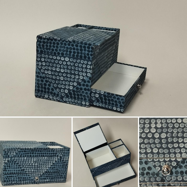 Desserte de bureau réalisée en carton bois gainé de papier fantaisie.