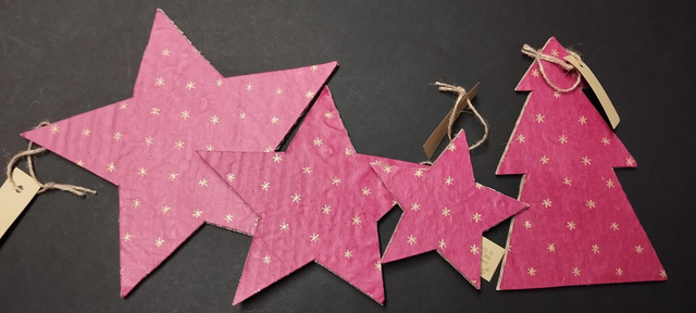 Lot rouge etoilé comprend : 2 étoiles 20cm, 1 étoiles 14cm, 1 étoile 10cm et 1 sapin 17cm
